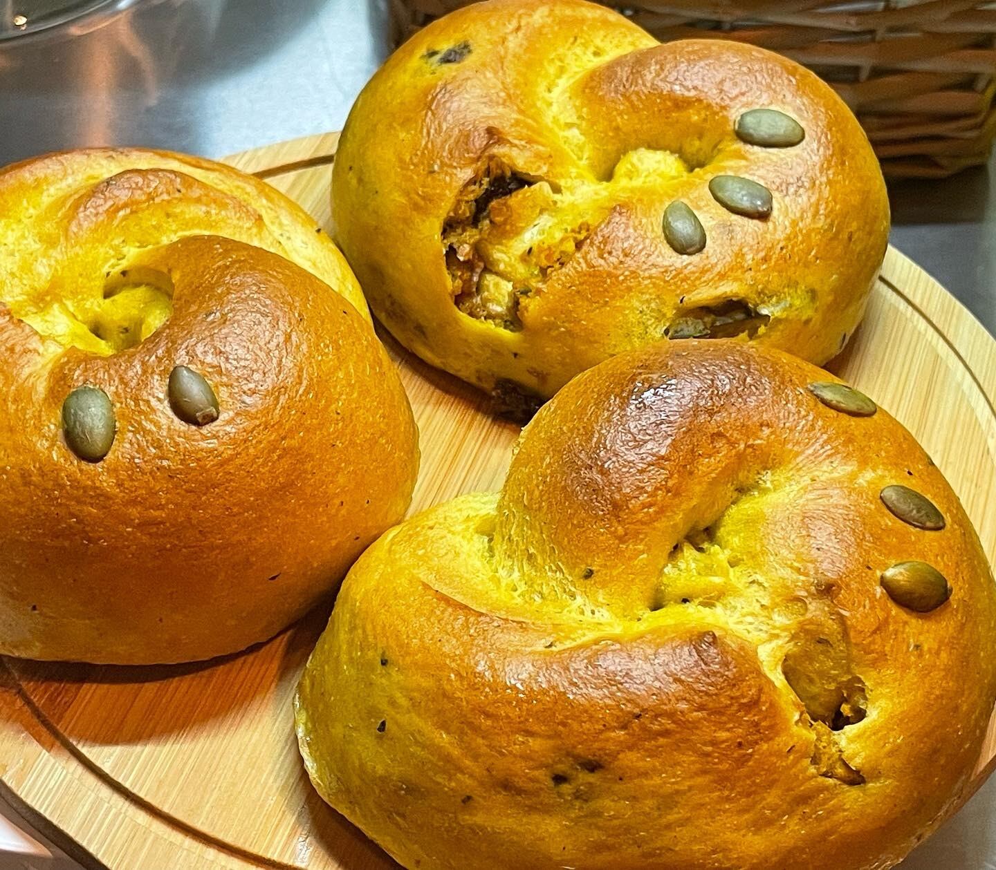 もっちもちの南瓜生地は、北海道南瓜を配合した綺麗な南瓜色♡こんがり焼いた ペッパーベーコンと南瓜サラダを包みました。