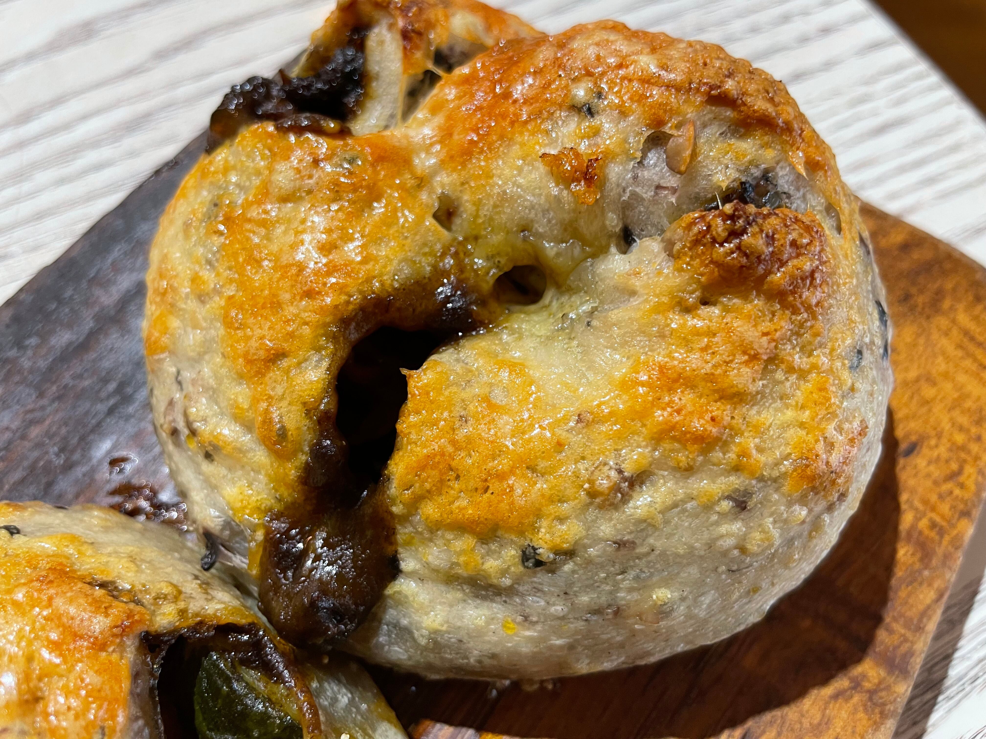 全粒粉100%生地にほぐし牛カレーを包んだベーグル。カリッとチーズが良いアクセント!!